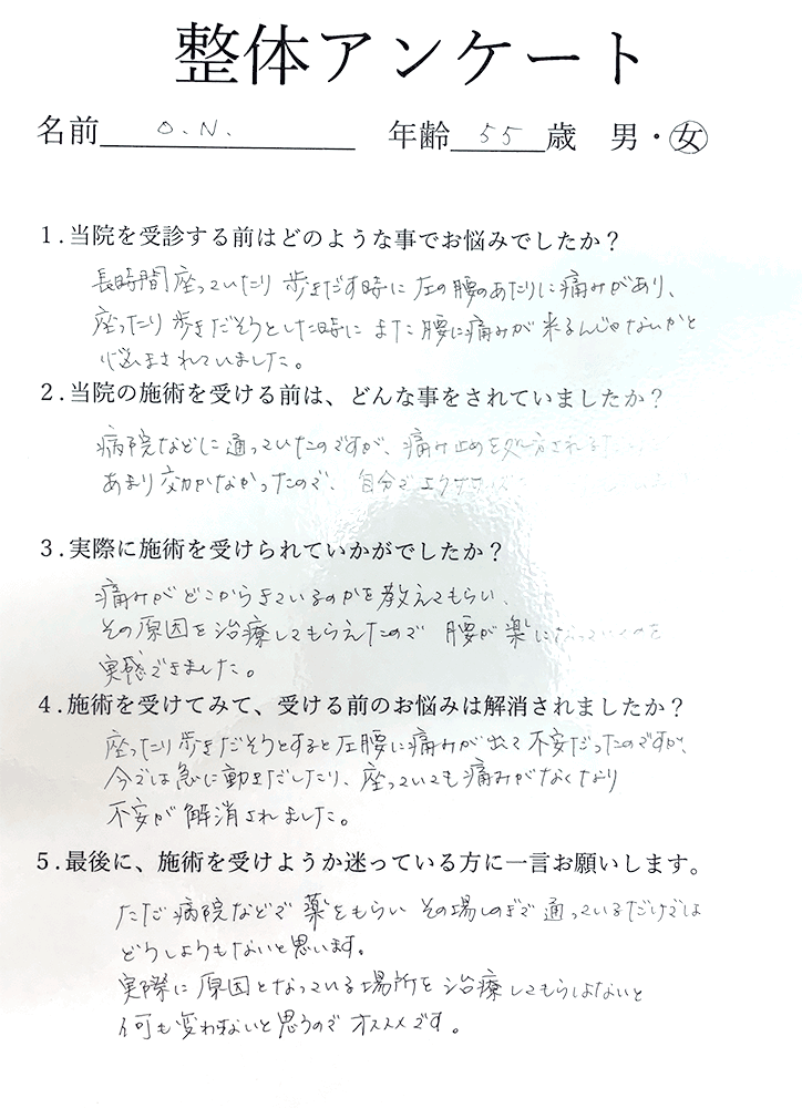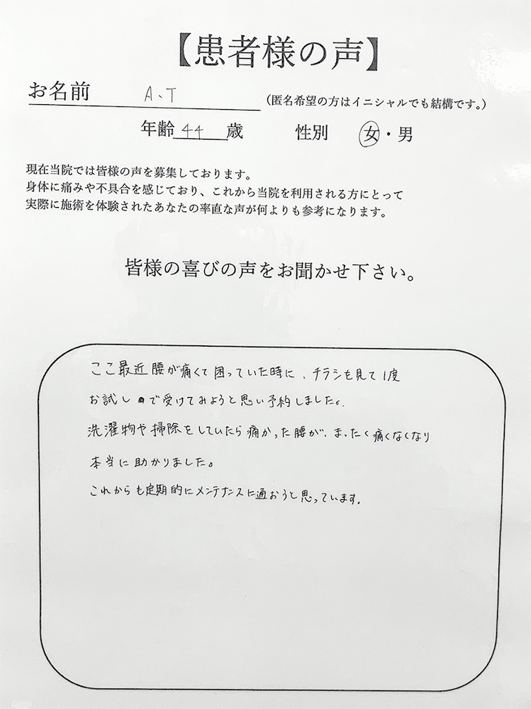 何故この痛みがあるのか等、私の質問責めにいつも丁寧に説明して下さり、家でできる体操や改善策も教えてもらっています。