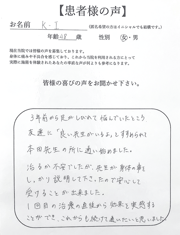 3年前から足がしびれて悩んでいたところ、友達に「良い先生がいるよ」とすすめられて本田先生の所に通い始めました。