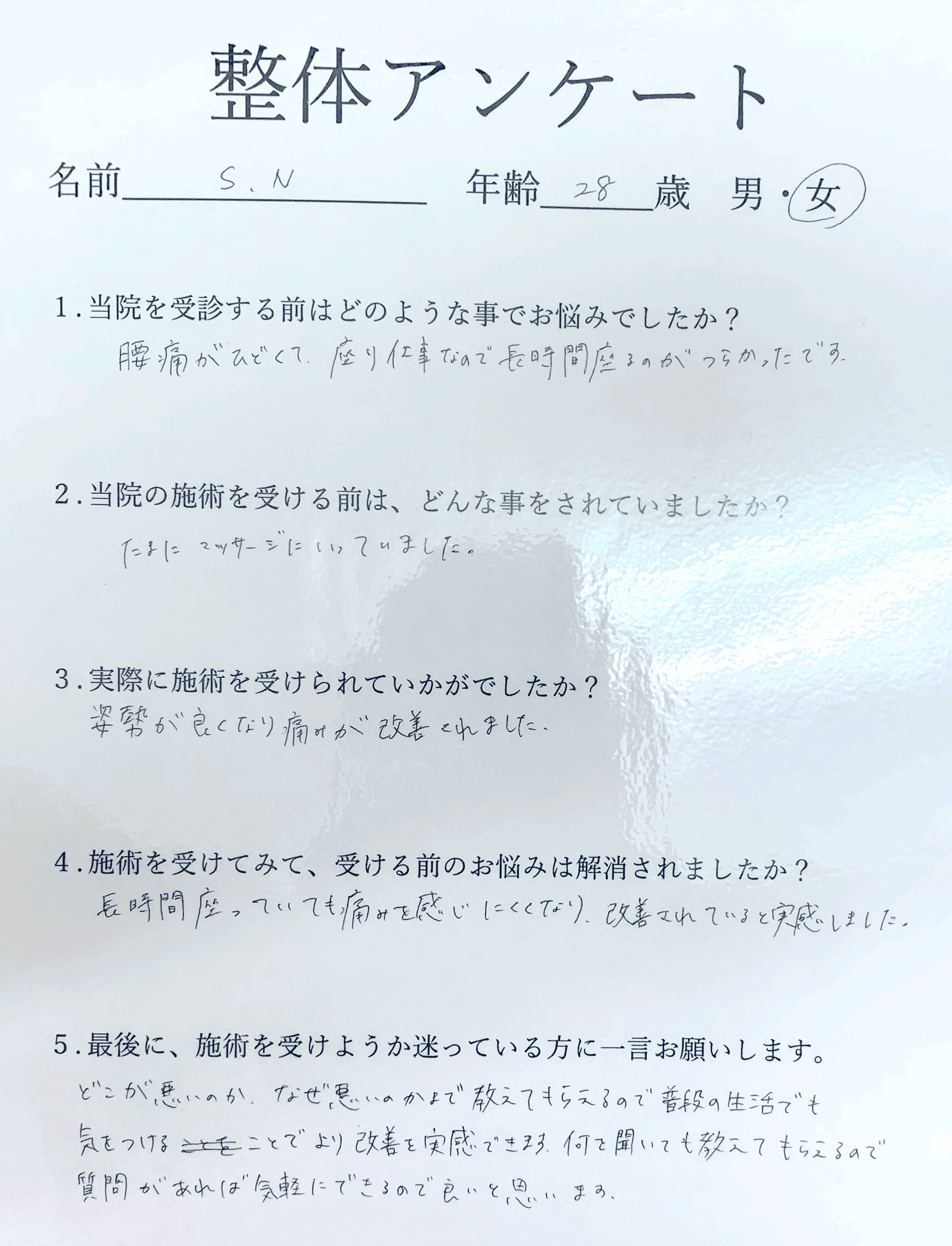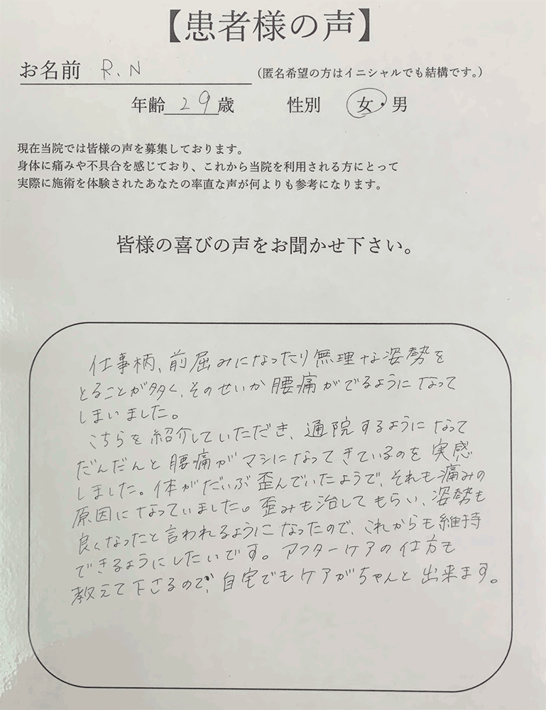 こちらを紹介していただき、通院するようになってだんだんと腰痛がマシになってきているのを実感しました。体がだいぶ歪んでいたようで、それも痛みの原因になっていました。歪みも治してもらい、姿勢も良くなったと言われるようになったので、これからも維持できるようにしたいです。