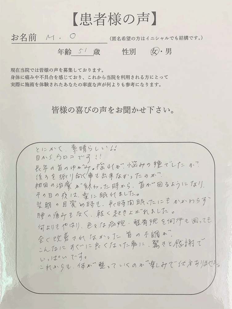 何よりもやはり、いろいろな病院・整骨院を何件も回っても全く改善されなかった首の不調が、こんなにすぐ良くなった事に驚きと感謝でいっぱいです。