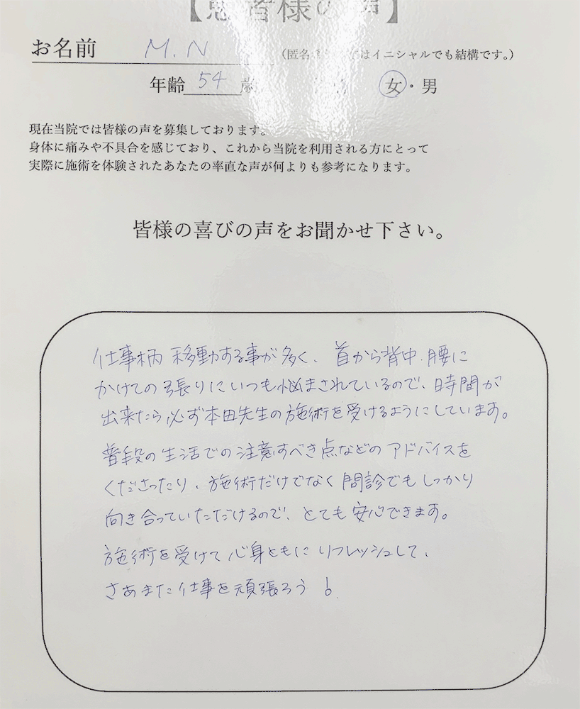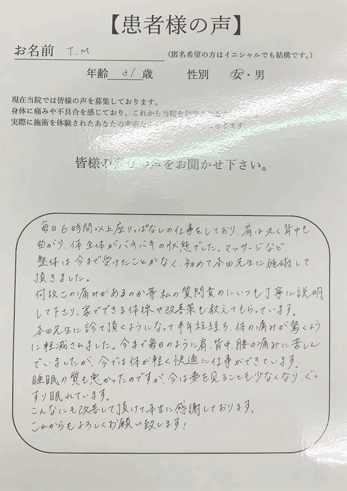 本田先生に見て頂くようになって半年程経ち、体の痛みが驚くように軽減されました。今まで毎日のように肩、背中、腰の痛みに苦しんでいましたが、今では体が軽く快適に仕事ができています。