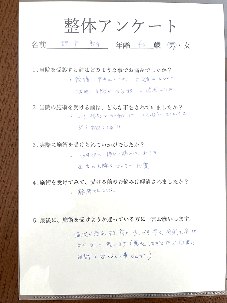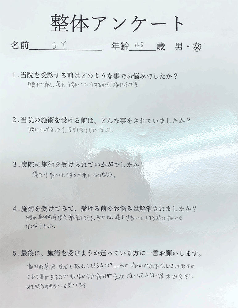腰痛、背中のいたみ、左足首のしびれが就寝に支障が出る程の症状でした。