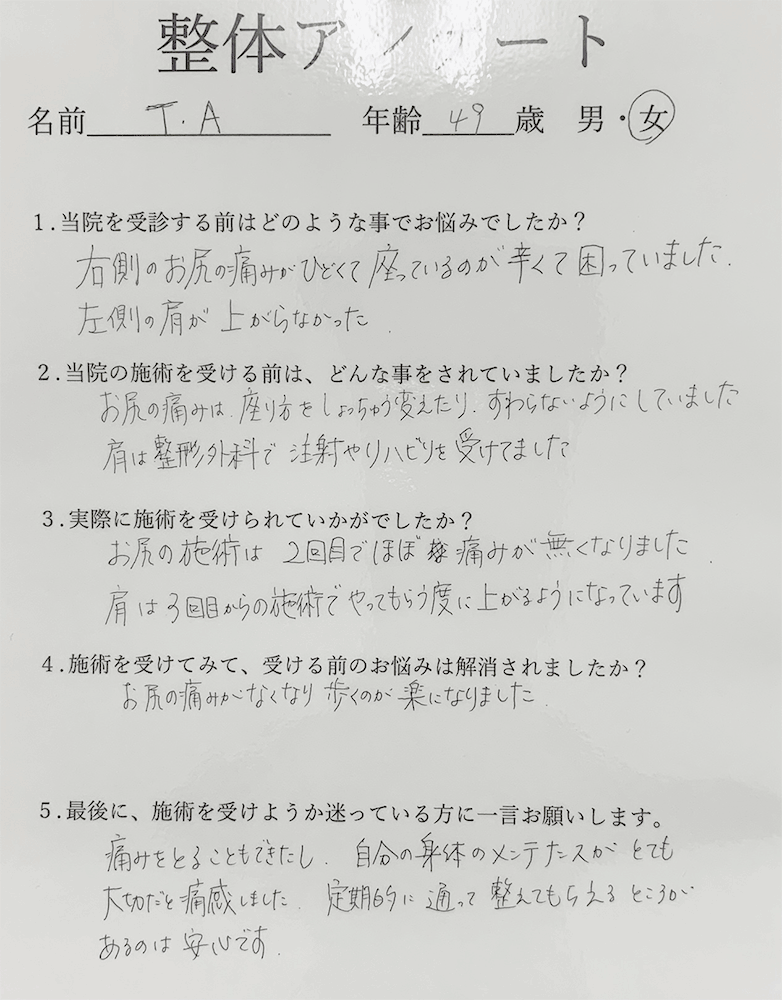 治るか不安でしたが、先生が身体の事をしっかり説明して下さったので安心して受けることが出来ました。