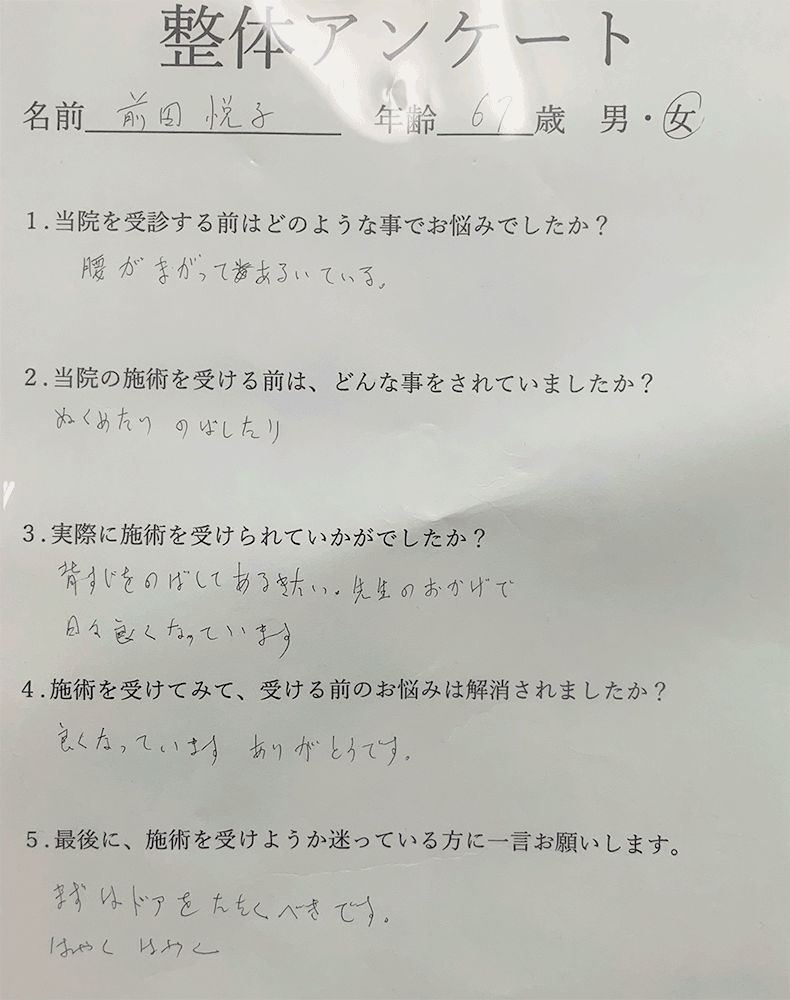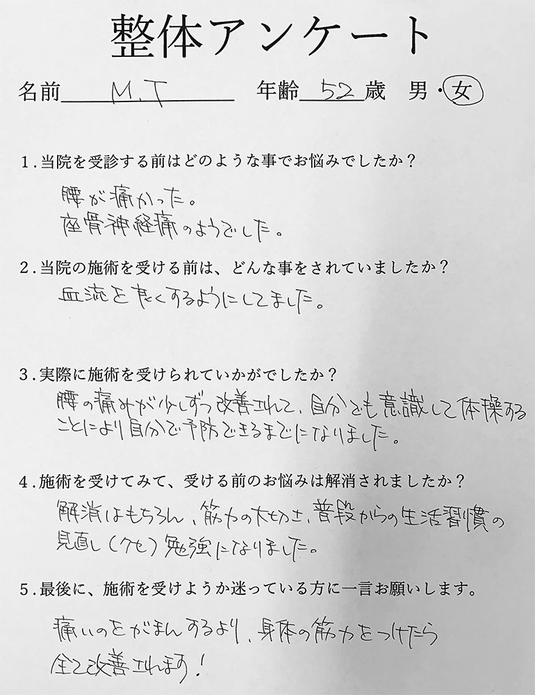 腰の痛みが少しずつ改善されて、自分でも意識して体操することにより自分で予防できるまでになりました。