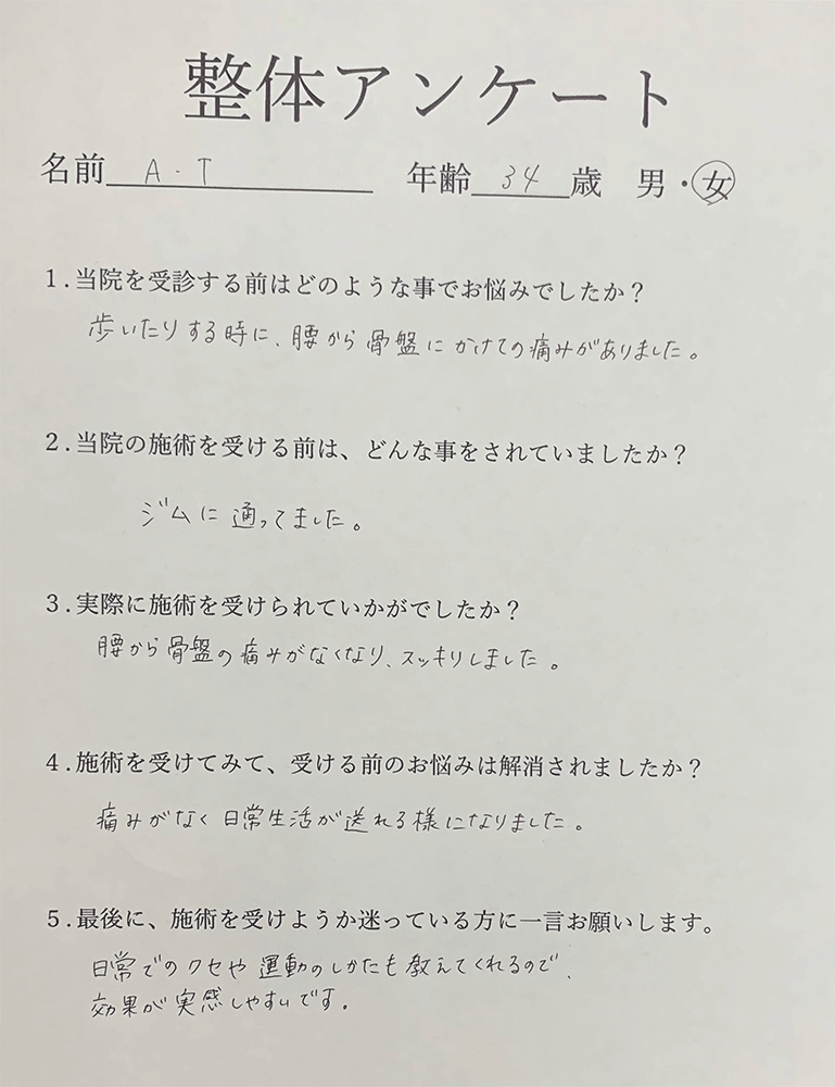 腰から骨盤の痛みがなくなり、スッキリしました。