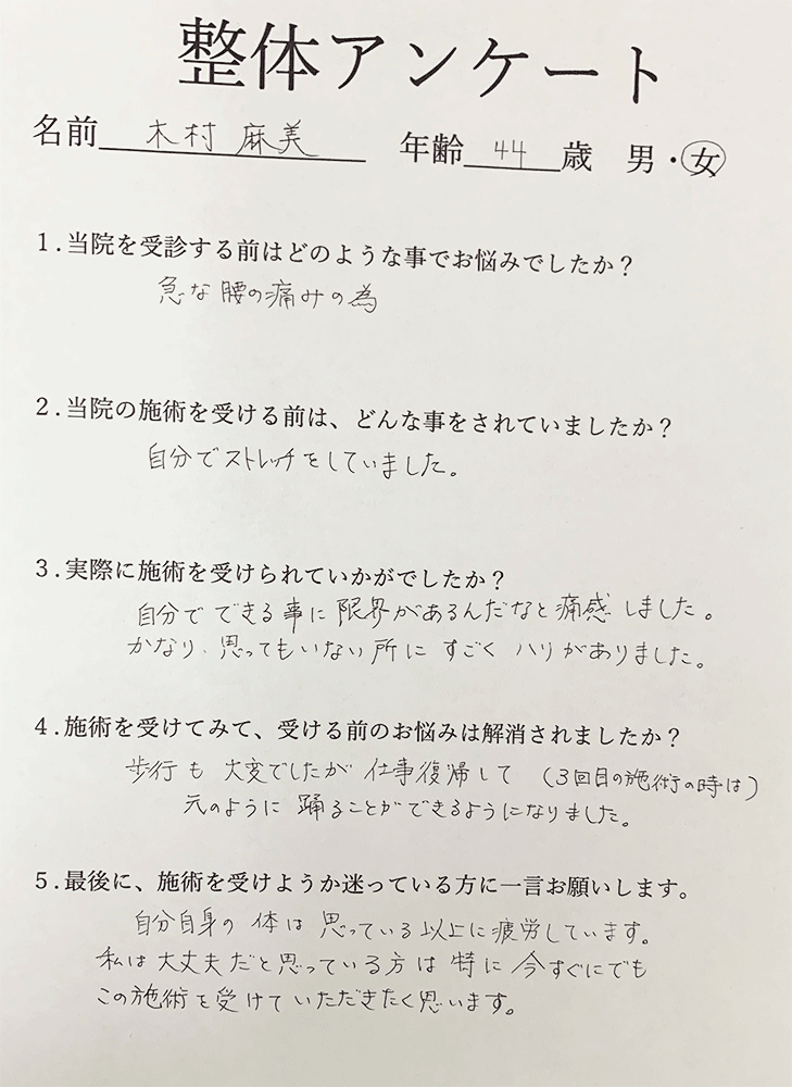 一回目の施術で、体の捻る際の可動範囲が大幅にひろがって驚きました。