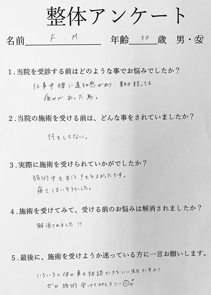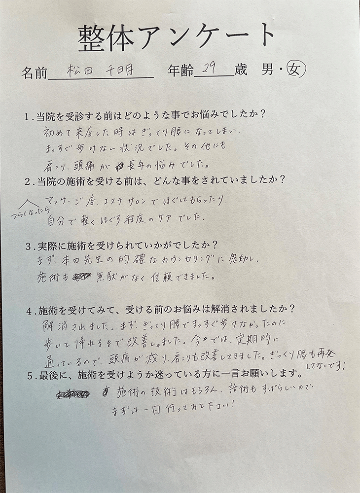 毎日6時間以上座りっぱなしの仕事をしており、肩は丸く背中も曲がり、体全体がバキバキの状態でした。マッサージなど、整体は今まで受けたことがなく、初めて本田先生に施術して頂きました。